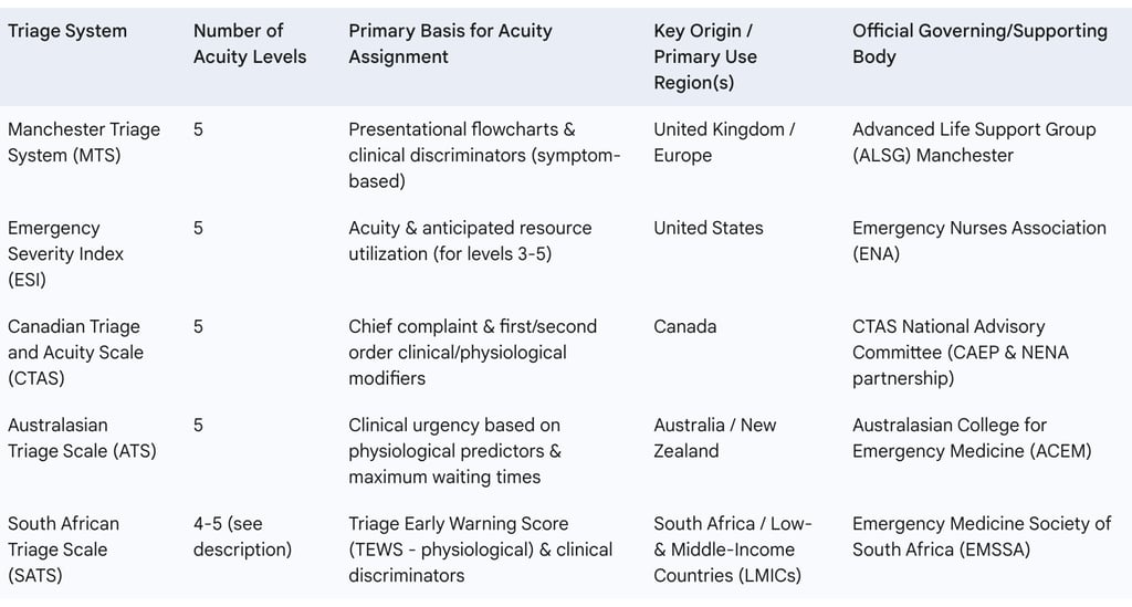 This report provides a comprehensive analysis of five prominent emergency triage systems: the Manchester Triage System (MTS), the Emergency Severity Index (ESI), the Canadian Triage and Acuity Scale (CTAS), the Australasian Triage Scale (ATS), and the South African Triage Scale (SATS). Each of these systems represents a widely recognized and utilized tool for standardizing the complex process of patient prioritization in the emergency setting. While most of these systems employ a five-level acuity scale, they exhibit variations in their underlying methodologies, decision-making frameworks, and the specific clinical discriminators they employ.