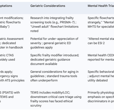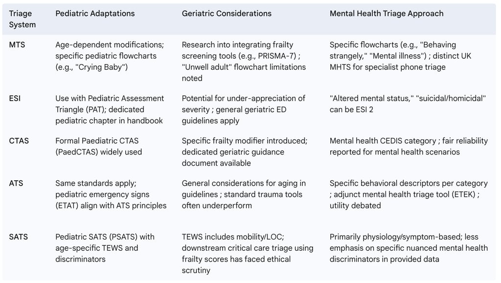 Improved Adaptations for Special Populations: Further development and rigorous validation of more nuanced and integrated approaches for geriatric patients (e.g., standardized frailty assessment within triage) and those with acute mental health conditions are essential.