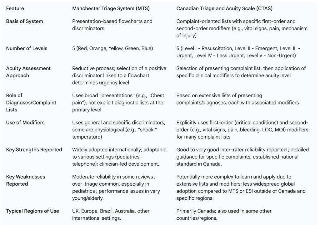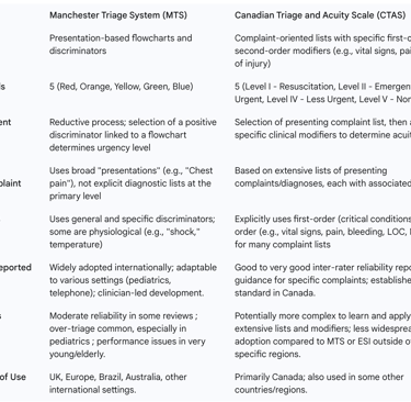 The more structured and detailed complaint lists with specific physiological and situational modifiers in CTAS offer a contrast to the MTS's reliance on broader presentational flowcharts and a more limited set of general and specific discriminators. While CTAS's approach might enhance precision for common diagnoses and potentially contribute to its reported higher reliability, this must be balanced against considerations of ease of use, training duration, and the cognitive load placed on triage nurses.