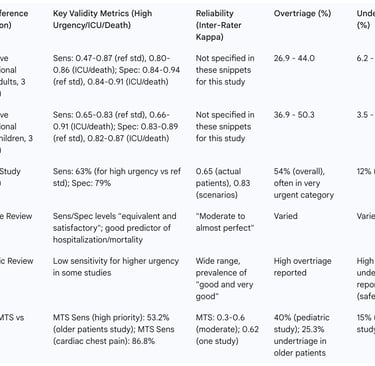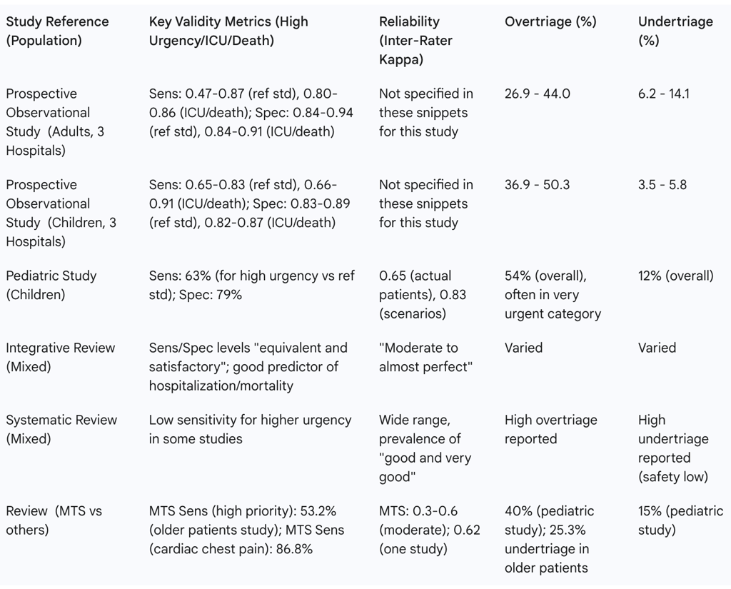 Over-triage and Under-triage: As previously discussed, these misclassification issues persist. While MTS often demonstrates a tendency towards over-triage, particularly in pediatric populations , which can strain ED resources, under-triage remains a critical safety concern due to the risk of delayed care for seriously ill patients. Some studies have indicated that the system's safety margin can be low due to instances of significant undertriage and suboptimal sensitivity in identifying patients requiring the highest levels of urgency.