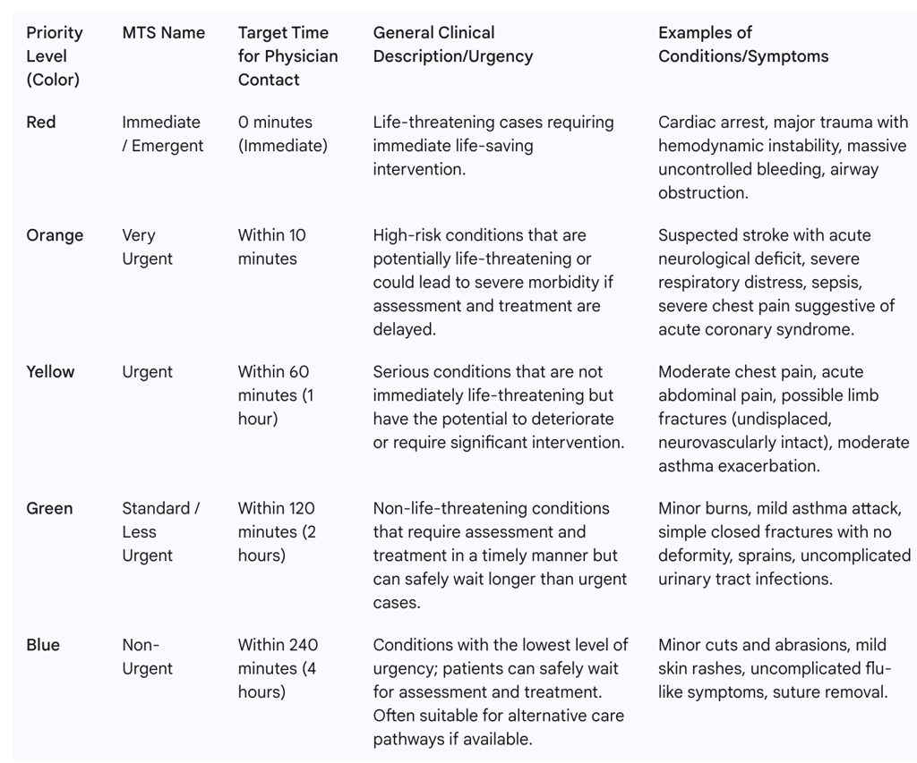 The MTS categorizes patients into five priority levels: Immediate (Red), Very Urgent (Orange), Urgent (Yellow), Standard (Green), and Non-Urgent (Blue), each with a corresponding maximum waiting time for medical assessment.