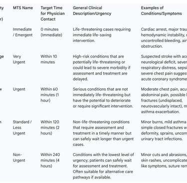Time Window Allocation: This assigned urgency level dictates the maximum permissible time window within which the patient should have their first contact with a physician or, in some interpretations, an advanced practice provider. It is critical to note this target time is for first assessment, not necessarily the commencement of definitive treatment.