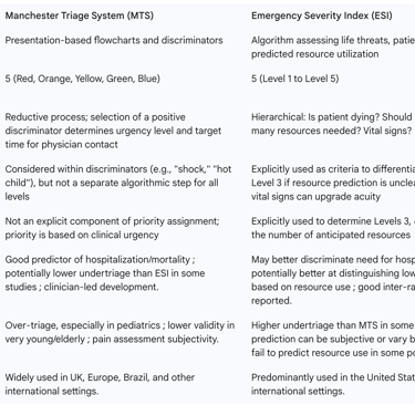 Methodology: MTS relies on approximately 52 presentation-based flowcharts and specific discriminators to assign an urgency level tied to a maximum waiting time for physician assessment. In contrast, the ESI algorithm first assesses for immediate life-threatening conditions (Level 1) and then for high-risk situations where a patient should not wait (Level 2). For patients not meeting Level 1 or 2 criteria, ESI Levels 3, 4, and 5 are determined by predicting the number of different types of resources (e.g., labs, imaging, IV fluids, consultations) the patient is likely to require. The ESI also incorporates vital signs more explicitly in distinguishing between certain levels, particularly between Level 2 and Level 3.